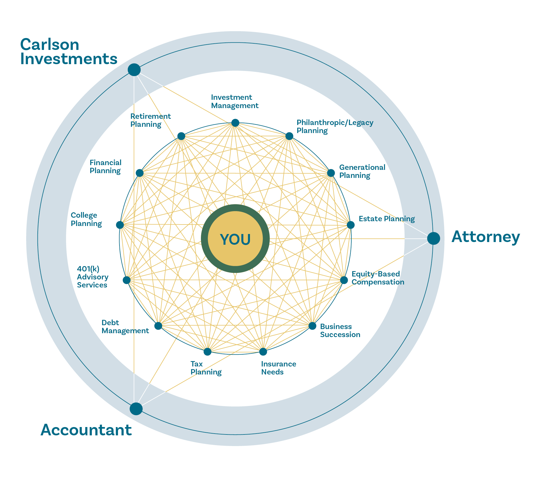 At Carlson, you are at the center of everything we do. Surrounding you are the essential elements that make up your financial life: retirement planning, investment management, tax strategy, estate planning, insurance, and more. Each component connects to the others, forming an integrated system that works best when managed holistically.