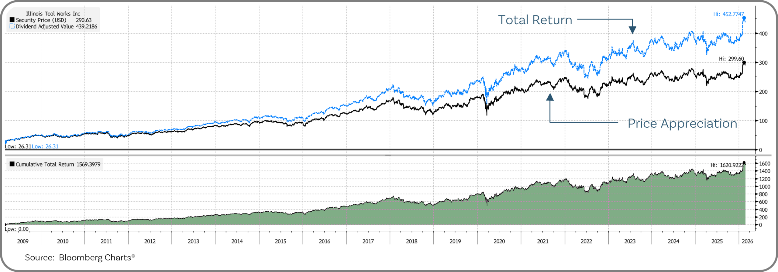 The chart below shows the compounding effect for Illinois Tool Works (ITW) over a 17-year period. The price change for this stock was 1,005%. But when adding the compounding effect of dividend reinvestment, the total return was 1,569%! The difference doesn’t appear significant in the early years but is very impactful over the long haul.